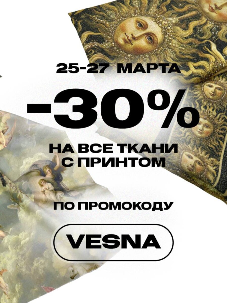 ! По промокоду VESNA ➡️НА САЙТ⬅️ Условия акции: ◦ Скидка действует с 25 по 27 марта на все ткани с принтом ◦ Скидка действует при заказе online и в розничном магазине ◦ Не суммируется с дисконтной картой ◦ Не суммируется с другими акциями и скидками