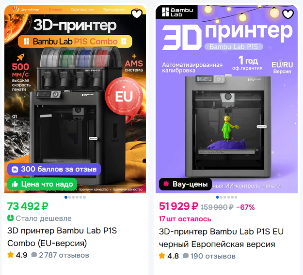 Я присмотрела себе 2 модели, точнее модель одна, но она отличается наличием модуля AMS - эта та самая штука, которая на картинке слева установлена на принтере, на справа - нет. Разница в цене получается значительная.