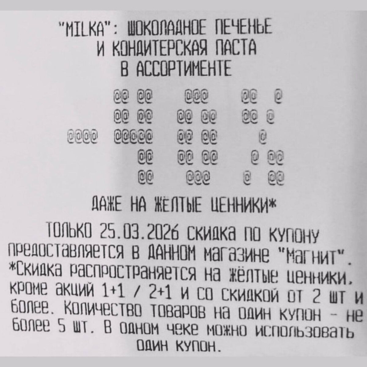 Сегодня при покупке от 100₽, на кассе магазина выдают слип-чек на скидку 40% на печенье и пасту Milka (можно просто попросить у кассира). Скидка распространяется даже на жёлтые ценники!