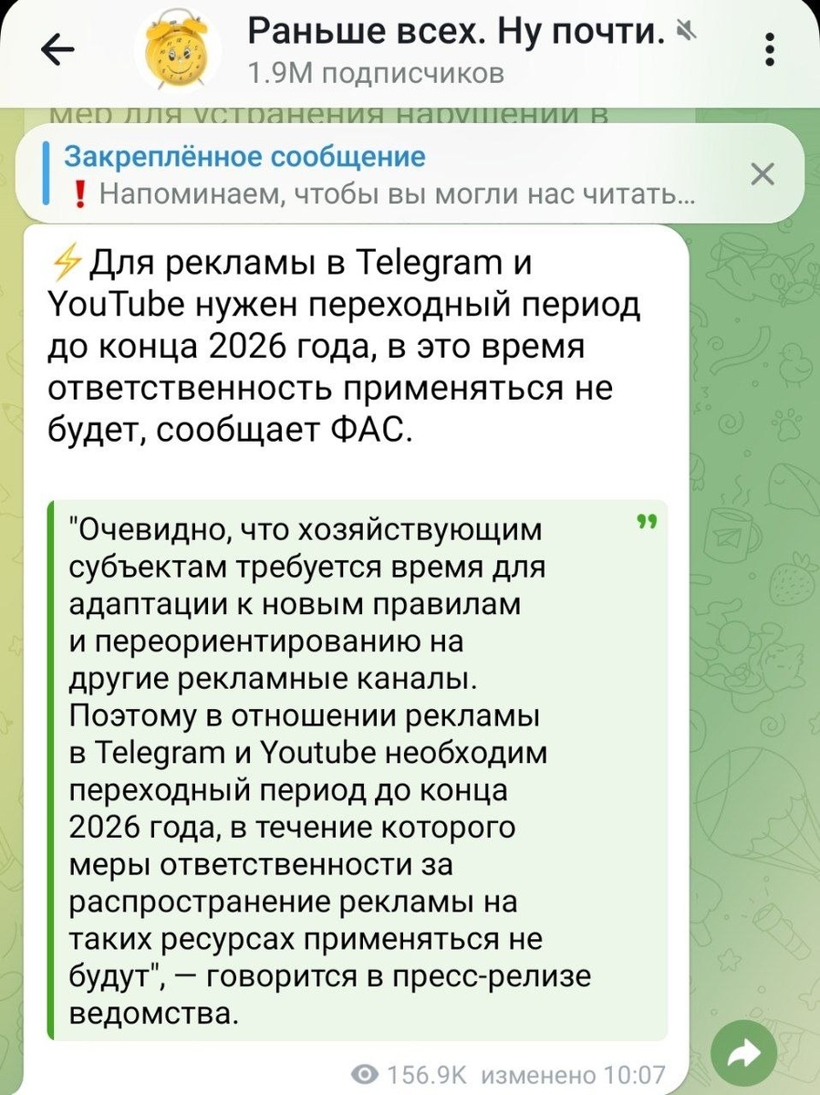 ! Вышла новость от ФАС! Говорят, переходный период будет до конца 2026 года Ура! Есть время на: - Развить свои Мах каналы (у Клуба есть программа по развитию таких, назвали Релокация в МАХ) - Перестроить свою рекламу. Например, мы в Клубе директоров делаем продвижение клиентов не в телеграме, а на Портале Клуба директоров и в его социальных сетях. Пишем статью, которую потом читают вся база Клуба: подписчики соцсетей, мессенджеров, емайл рассылки. То есть продвижение в сообществе на разрешённых ресурсах, а не в "запретном" телеграме. И всем шампанского! 🍾 Клуб директоров - переживём кризис вместе!