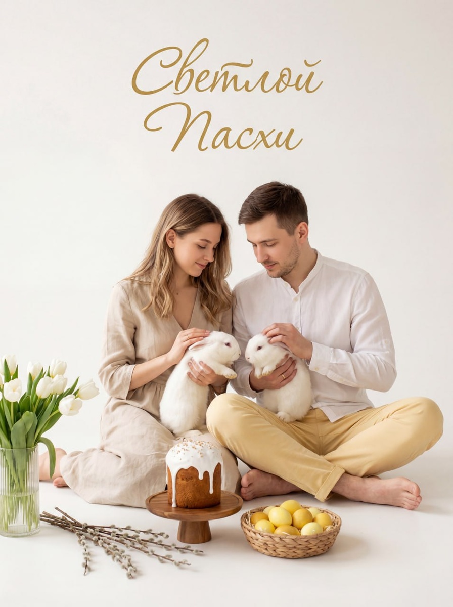 Открытка на пасху :) Если нужны другие открытки, вам сюда https://prompt1.ru/tematika-izobrazheniya/otkrytki/ Создай фото. ## Идентичность персонажей Использовать входные фото как единственный источник внешности. Лица строго идентичны оригиналу: сохранить геометрию лица, расстояния между глазами, форму носа, губ, скул и челюсти. Цвет и текстуру кожи — без изменений, без улучшений и стилизации. Не менять возраст, не старить. Морщины можно слегка сгладить, сохраняя естественность. Сохранить длину и цвет волос. Без beautification, без замены на типовые лица. Каждое лицо уникально и не смешивается с другими. В кадре только персонажи из входных фото, каждый присутствует один раз. ## Композиция и кадр Фотореалистичная студийная съёмка, вертикальный кадр, полный рост. Количество персонажей определяется входными фото (один человек, пара или семья). Все сидят на белом полу в спокойной естественной позе, расположены рядом или по центру. Без сложных перекрытий, чистая и лаконичная композиция.