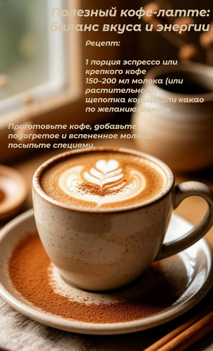 ☕️ Утренний кофе - это не просто напиток, а целый ритуал. Он помогает проснуться, настроиться на день и получить удовольствие. Но если вы стремитесь к более сбалансированному питанию, классический латте с сиропами и сахаром - не всегда лучший выбор. ☕️ Классический латте сам по себе не вреден, а проблема часто в добавках : сахар, сиропы, сладкие сливки и в результате напиток превращается в десерт с высоким гликемическим индексом. Несколько простых приёмов для "правильного" кофейного латте ⬇️ ✔️добавляйте корицу или ваниль ✔️используйте естественную сладость молока ✔️можно добавить немного фиников или банана ✔️выбирайте качественные ингредиенты 📖 Есть множество вкусных и полезных альтернатив, которые сохраняют уютную "латте-атмосферу", но при этом поддерживают здоровье и энергию. 📖 Сделала карточки с рецептами - пробуйте, делитесь в комментариях - какой рецепт больше понравился 📖