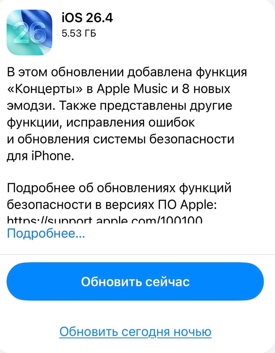 Хотя ожидаемых улучшений Siri нет, система получила ряд новых функций. В Apple Music появился Playlist Playground: теперь можно создавать плейлисты по текстовому описанию, а также добавлять треки сразу в несколько списков. Добавлены 8 новых эмодзи и функция «Концерты рядом с вами». Появилось офлайн-распознавание музыки, а в Apple Podcasts — поддержка видеоподкастов с загрузкой и переключением между аудио и видео. Защита украденного устройства теперь включена по умолчанию. Обновлён интерфейс аккаунта Apple и App Store, добавлен виджет Ambient Music для сна и концентрации. В «Напоминаниях» появился раздел срочных задач. Также улучшены функции «Здоровье», добавлен Audio Zoom в камере и поддержка AI-сервисов в CarPlay. Обновление исправляет более 35 уязвимостей и рекомендуется к установке.