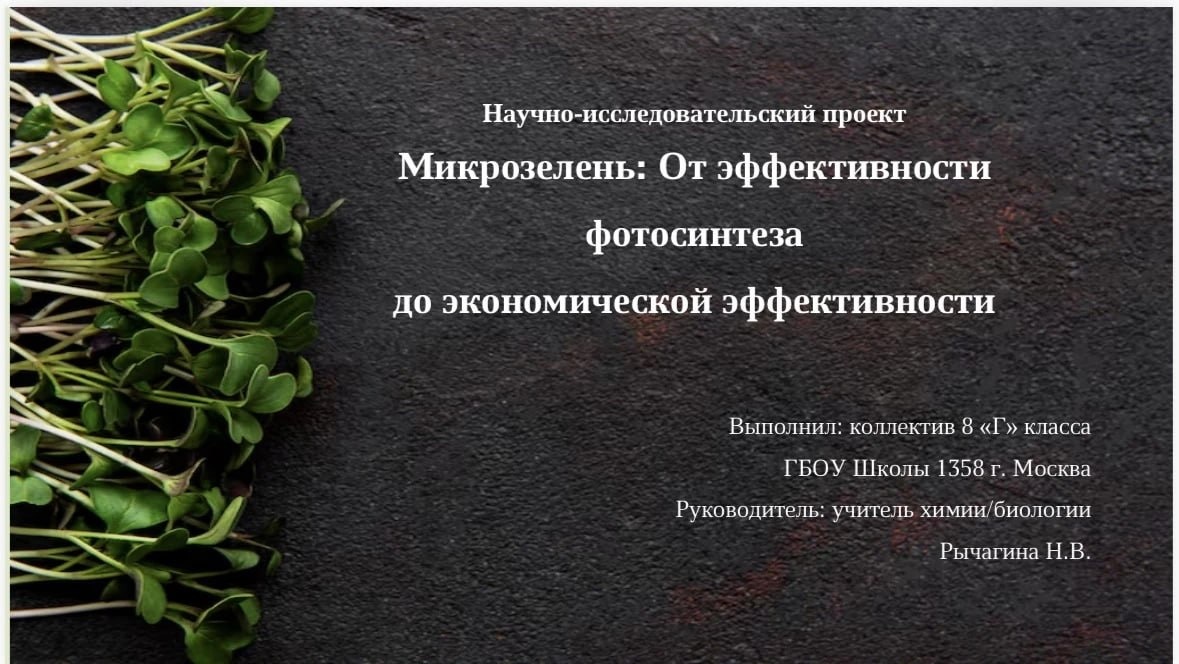 Естественно-научный цикл декады науки Коллективный проект 8"Г" класса «Микрозелень: Зеленый свет для бизнеса и науки» исследовал микрозелень не только как модный гастрономический тренд, но и как высокотехнологичную культуру. Первая часть работы была посвящена физиологии: в фазе семядолей растения работают на пике эффективности фотосинтеза (до 85% от потенциала), обходясь без «затрат» на развитие сложной корневой системы и одревеснение стебля. Эта биологическая особенность позволяет получать урожай, богатый хлорофиллом, витаминами и антиоксидантами, всего за 7–14 дней. Вторая часть работы доказала экономическую целесообразность модели. Благодаря высокой оборачиваемости посевных площадей (до 25 циклов в год), минимальным потребностям в субстрате и возможности вертикального фермерства, выращивание микрозелени в условиях городской агрофермы рентабельно. Мы выявили, что оптимизация позволяет не только ускорить метаболизм растений на 20–30%, но и снизить себестоимость конечного продукта за с