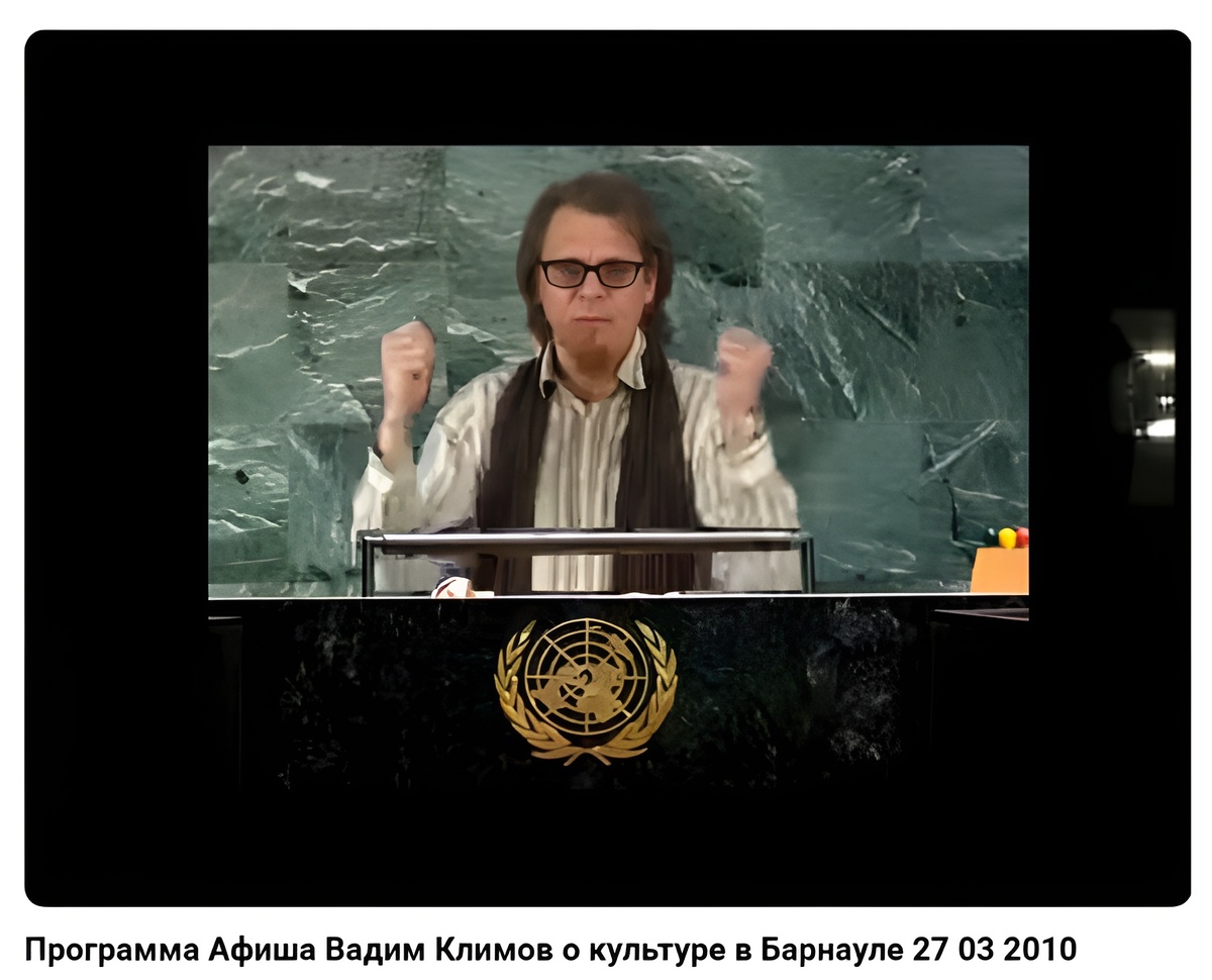 В кадре я вещал с трибуны ООН. Хотел постучать ботинком, но не смогли «вырезать». ИИ не было, все делали на коленке. «Трудящиеся и буржуазия! Сегодня мы поднимаем флаги за великий труд гуманистов - работников культуры.
