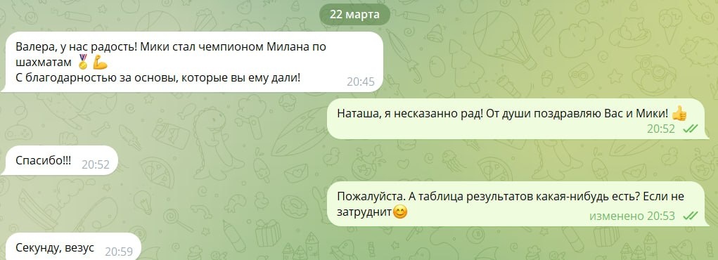 ! Просто мистика какая-то 😳 Не прошло и недели, как опубликовал пост о дне Рождения Мики и его шахматном торте, как он снова отличился. Уже в другой ипостаси. На скрине сообщение его мамы: Мики стал чемпионом города Милана в возрастной группе до 8 лет!🏆 Ниже таблица результатов. Первая строчка - наша!👇 Поддержим юного чемпиона - ❤️ #отзывы #кейсы