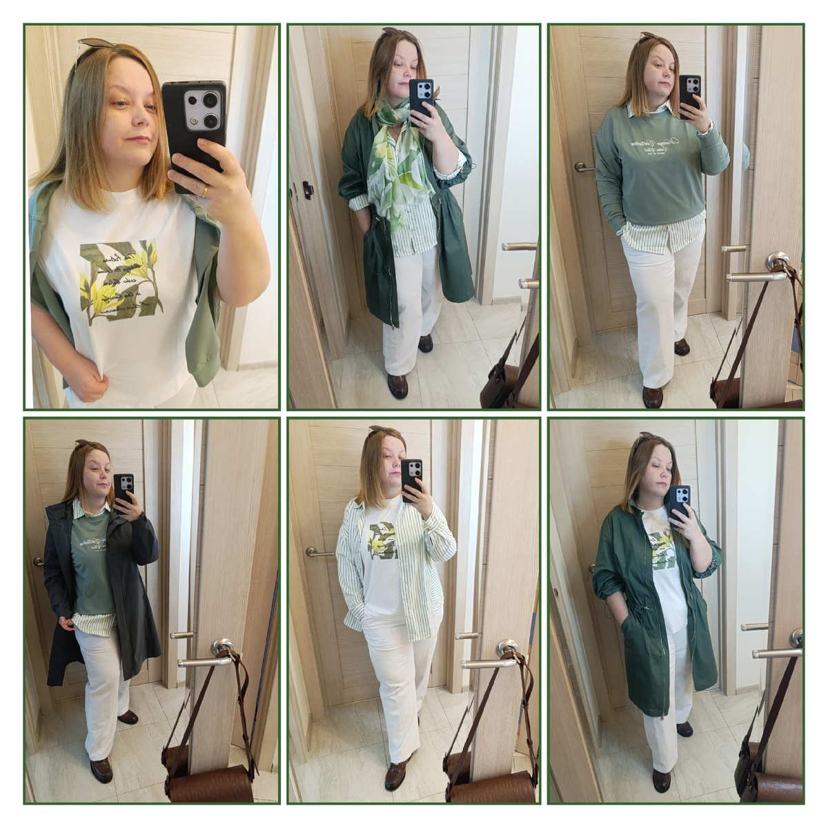 Важно отметить, что выбран не просто «зеленый», а его благородные, приглушенные оттенки: шалфей, фисташковый, оливковый и изумрудный. Такие тона, приближенные к природным, одинаково гармонично смотрятся как с чистым белым, создавая графичный контраст, так и с коричневым (в обуви и сумке). Подчеркну, что палитра одновременно классическая (не выходящая за рамки базовых сочетаний) и достаточно цветная, чтобы избежать скуки, присущей тотально монохромным образам.