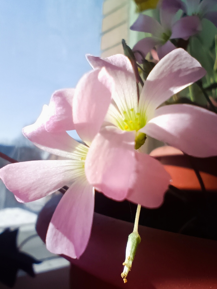 На солнечном подоконнике греется Снежок в теплых лучах весеннего солнышка и цветëт кислица.