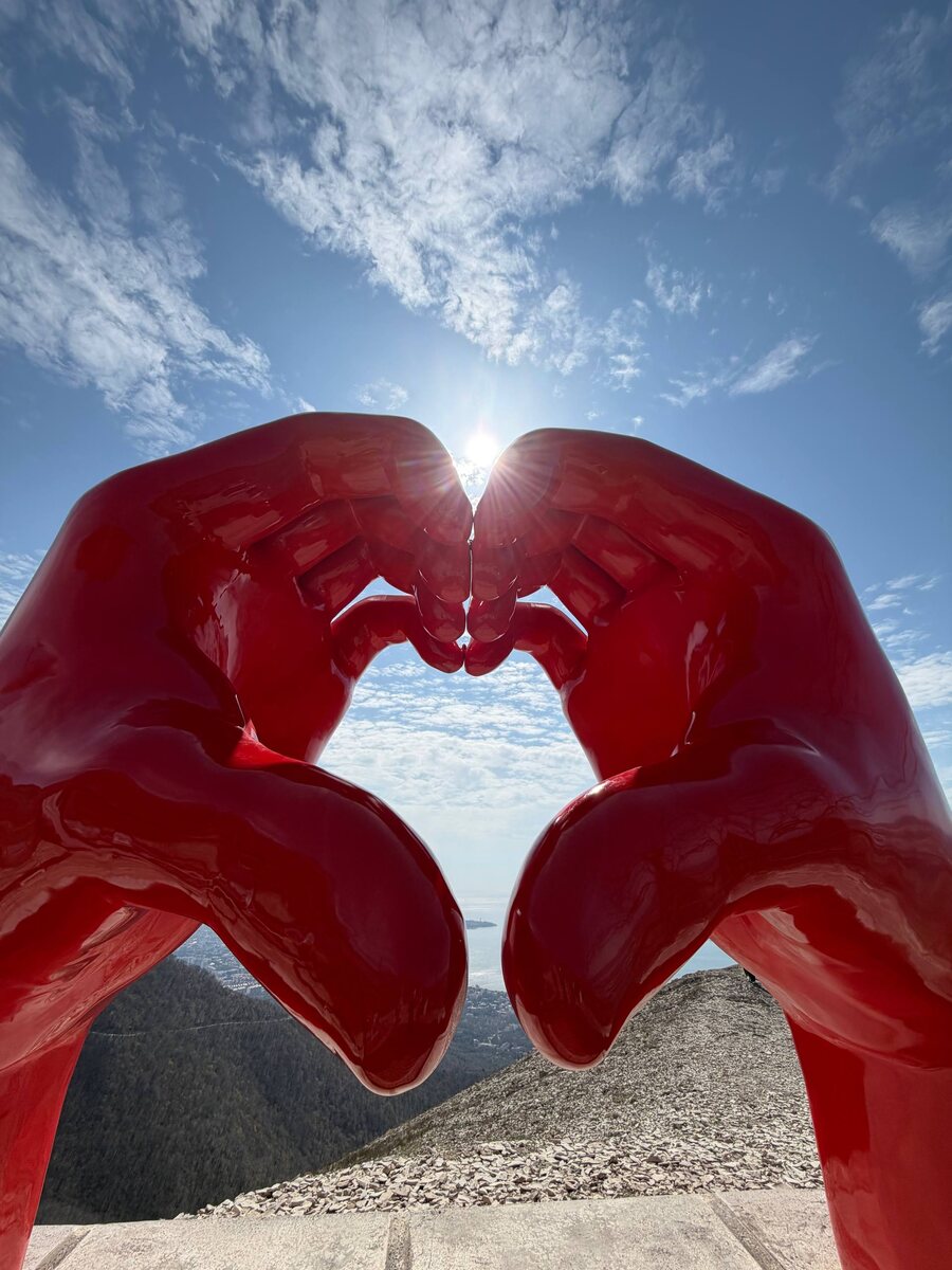 Это яркая скульптура «руки в форме сердца» на смотровой в горах по маршруту «терренкур Маркотх. Вторая очередь» Находится старт на трассе М4. Напротив заправки Уфимнефть Протяженность маршрута 3 км в одну сторону. Всё оборудовано: карта на старте, размеченная трасса, освещение, зоны отдыха с качелями и лавочками (пока правда две такие точки на маршруте) «Красные руки» находятся на второй вершине из трех этой горы. У скульптуры есть лавочки и зона отдыха На самом верху тоже оборудовали ещё зону со спортплощадкой и качелями. Можно подняться по хребту вверх или по пологой дороге Общая сложность 3,5-4 из 5. Умеренно круто для людей без подготовки (первый Маркотх чуть легче по мнению нашей редакции). Но оно того точно стоит Около 1-1,5 часа занимает подъем 📍Координаты старта: 44.593018, 38.060199 🛜Геленджик на связи