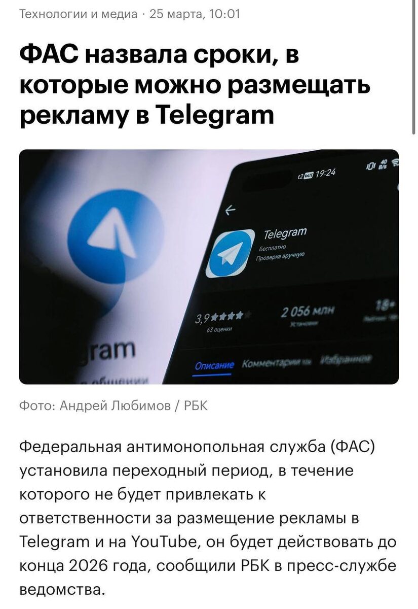 » 👇 До конца 2026 года за рекламу в Telegram и YouTube штрафовать не будут - ввели переходный период. Но важно: формально реклама там по-прежнему считается незаконной, просто бизнесу дают время перестроиться и перераспределить бюджеты. А вот с Instagram и Facebook(запрещенные в РФ организации) - без поблажек. За размещение рекламы там уже сейчас наказывают. Так что пока на кайфе и есть время заняться дополнительными каналами получения заявок и продаж ☝️ Мы в T&M подключаем для наших заказчиков Макс. Пока цены за пдп мне там очень нравятся. Связка такая: Авито —> Лендинг (выступает как прокладка, так как нельзя сразу на Макс) —> Макс.