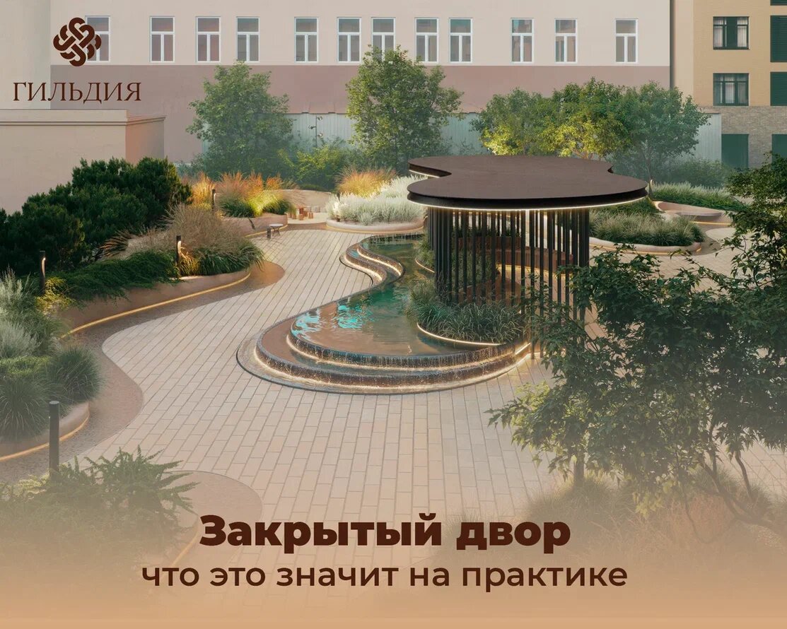 ☕️В обычном центре выход из подъезда — это резкая смена обстановки. Вы только что допили кофе в тишине квартиры — и сразу снова в общем потоке. Машины стоят бампер к бамперу, выхлоп в лицо, чужие голоса, детский крик эхом от стен. 🏠В «Гильдии» этот момент другой. Вы спускаетесь, открывается дверь — и шум остаётся снаружи. 🌳Перед вами — ваш закрытый мир. Тишина, которую чувствуешь сразу. Посередине тихо плещется водная гладь, отражает небо. Вокруг — многоуровневый сад от DEREVO PARK: свежий запах хвои, мягкий шелест злаков, дорожки, по которым хочется медленно пройтись. Напряжение дня начинает отпускать уже на первых шагах. 🏝Чуть дальше — лаундж-зоны. Кто-то из соседей спокойно читает в кресле. Кто-то просто сидит с кофе и смотрит на воду. В центре — деревянная пергола, где вечером можно собраться небольшой компанией. А рядом ваш ребёнок — бегает, смеётся, заводит друзей. И вы точно знаете: он в безопасности. Ни машин, ни посторонних. 🙂При этом во всём доме всего 163 квартиры. Поэт