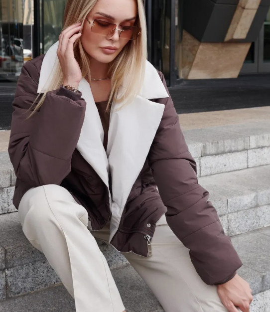 Куртка выполнена в двух трендовых оттенках — глубокий шоколад и мягкий беж. Такое сочетание выглядит очень «дорого» и легко вписывается в базовый гардероб. Манишка — отдельный плюс: она создаёт эффект многослойности без лишнего объёма и реально спасает от ветра. Особенно актуально для тех, кто не любит, когда в "душу задувает".