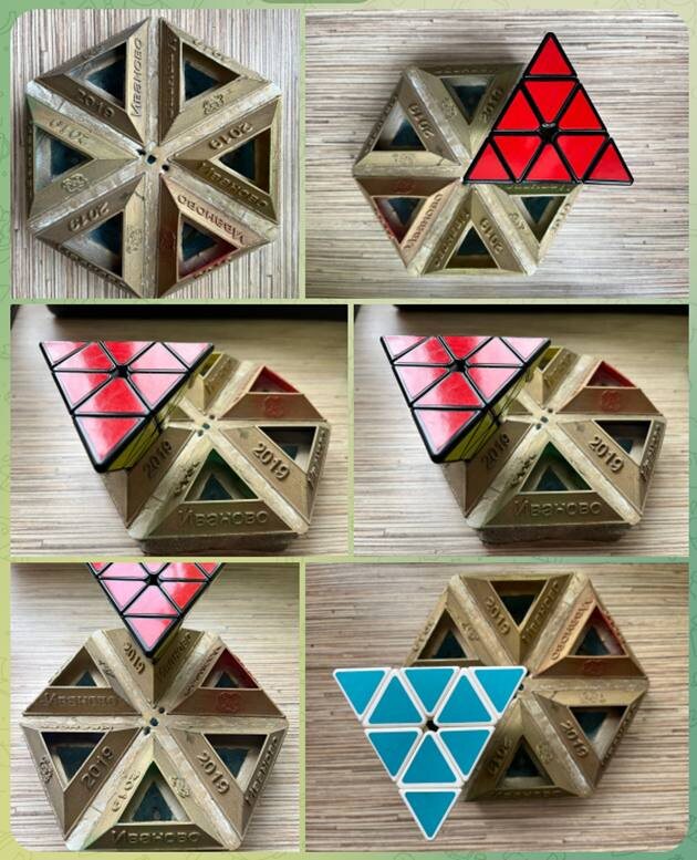 ! 🔺 Большинство спидкуберов привыкло к мозаикам из кубиков Рубика. А вот Андрей Маслов решил провести эксперимент и собрать рисунки из пирамидок! 🌟 Это гораздо сложнее, ведь сразу бросаются в глаза особенности сборки. 🌟 Во-первых, Андрей создал специальную подставку, на которой пираминксы закреплялись бы уголком и давали совместить грани сверху в единую композицию. 🌟 Во-вторых, существует и неочевидная для создания картины особенность у пирамиды: «Когда начинаешь собирать узоры на пираминксе, сразу начинаешь чувствовать конструктивные особенности этой головоломки: комбинации уголков и центров, закрепленные на осях, не позволяют собрать любой паттерн путем вращений. Для сборки некоторых паттернов [спидкуберы] механически меняют местами уголки (понимаю, но не принимаю такое читерство).» Поэтому Андрей долго сидел над изображениями и редактировал цветовые схемы так, чтобы их возможно было собрать без изменения конструкции пирамиды. 🌟 Есть и третья особенность: «Еще один вызо