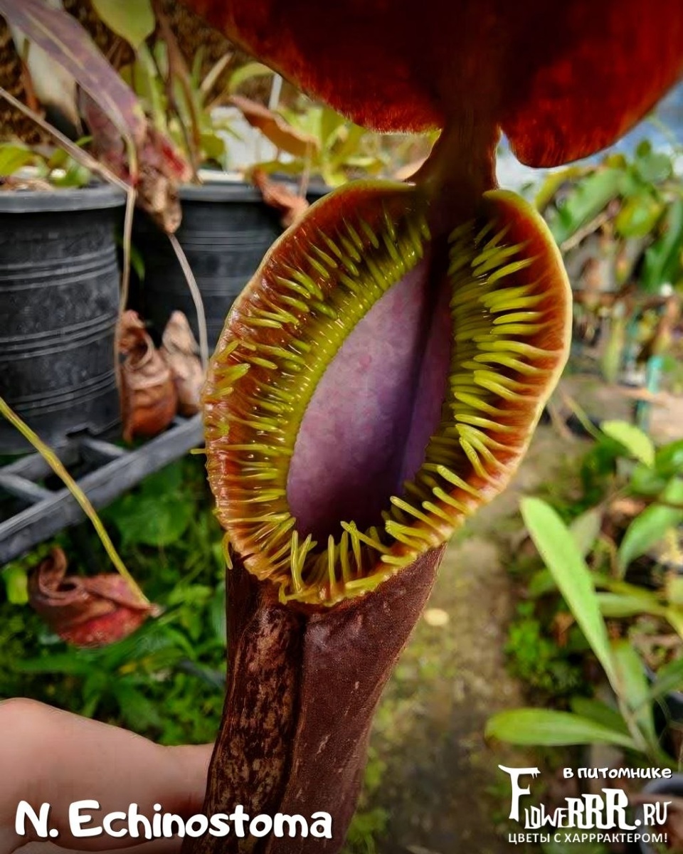 🦔 Редкий высокогорный вид непентеса, который отличается необычной формой перистома с шиповидными выростами и крупными кувшинчиками (до 25 см). Название echinostoma происходит от греческих слов echinos — «ёж» и stoma — «рот» и отражает характерную структуру ободка кувшина. N. Echinostoma произрастает в высокогорных районах острова Суматра, во влажных мшистых горных лесах с частыми туманами, на склонах хребтов и вдоль горных ручьев. Предпочитает очень высокую влажность воздуха (85–95%), прохладные температуры, рассеянный свет, частые осадки. Впервые непентес Echinostoma был описан в 1928 г. голландским ботаником Б. Х. Дэнсмором в работе The Nepenthaceae of the Netherlands Indies. Вид считается редким из-за разрушения среды обитания и незаконного сбора коллекционерами. Стал более доступен лишь в последние десятилетия благодаря микроклональному размножению. ❗️В нашем питомнике можно приобрести N. Echinostoma по цене от 8 000 ₽. Этот вид будет доставлен к нам в рамках поставки «Тайва