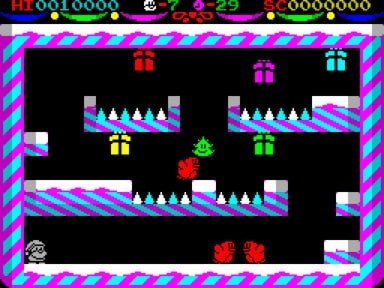 Праздничный платформер для ZX Spectrum от британской студии Little Shop of Pixels. Название — британское сленговое сокращение слова Christmas. В канун Рождества помощники Санты объявляют забастовку и прячут все подарки по дому. Игроку предстоит взять на себя роль Санты, который в одиночку должен собрать подарки в десяти уровнях-комнатах, чтобы спасти праздник. У героя нет оружия — разработчики называют его «убеждённым пацифистом». Врагов (летающих малиновок, движущиеся ёлки и ледяные кубы, меняющие траекторию) можно только перепрыгивать. Добавляют сложности шипы, ограничение по времени и не всегда точная детекция столкновений. Управление поддерживает джойстики Kempston, Sinclair Interface 2 и Cursor, а также клавиши Q (меню), P (пауза), G (старт). Для версии 128K доступна музыка на чипе AY. Яркая графика, рождественская атмосфера и ностальгический дух старой школы делают Crimbo достойным подарком для поклонников ретро-платформеров. 🕹 Играть онлайн