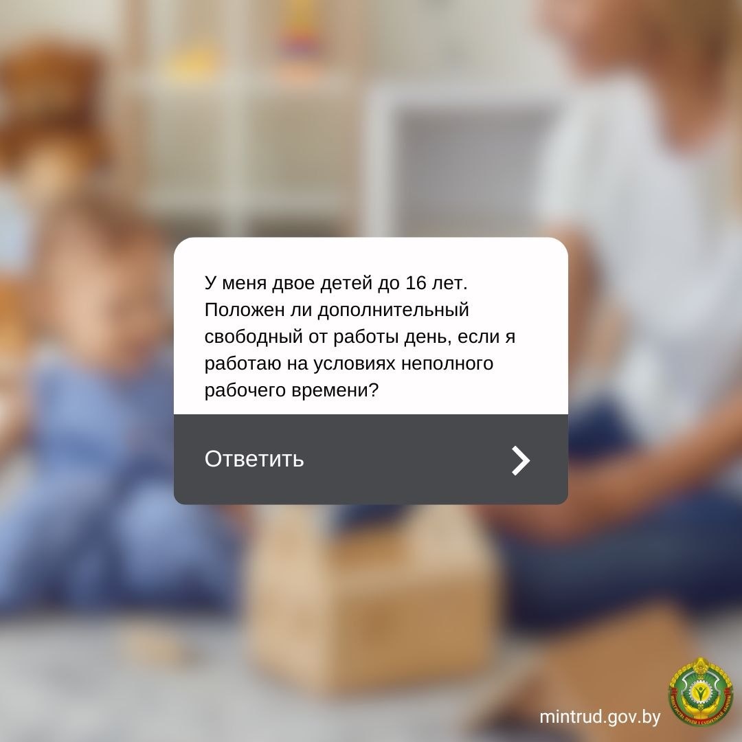 💡Согласно части третьей ст. 265 Трудового кодекса, мать (или отец, мачеха/отчим, опекун, попечитель), воспитывающая двоих детей в возрасте до 16 лет, имеет право на один дополнительный свободный от работы день в месяц. ➡️Это обязанность нанимателя и отказать он не может. 🕖Даже если вы работаете неполный рабочий день. ➡️Статус работы (основная, по совместительству) и форма занятости (полный/неполный день) значения не имеют. 👛 Оплата за этот день может быть предусмотрена коллективным договором или локальным актом организации. В иных случаях — день остаётся неоплачиваемым. 📄Как оформить? ⚧ Написать заявление (предварительно согласовав день с нанимателем) указать конкретный день или заявить право на весь год с возможностью корректировки. 🚻Наниматель издаёт приказ. ‼️Кстати, можно один раз подать заявление на весь календарный год, а если в каком-то месяце день не нужен — письменно предупредить нанимателя, и приказом этот месяц исключат. ➖➖➖➖ 💡 Право на дополнительный свободный ден