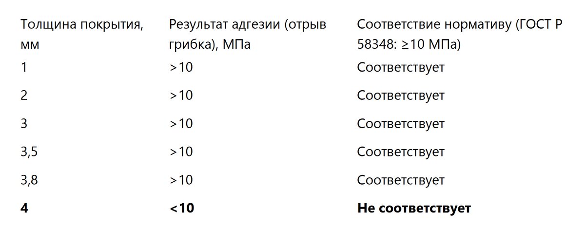 1. Зона стабильности: Образцы с толщиной до 3,8 мм включительно успешно прошли комплекс испытаний. Адгезия оставалась выше нормативного значения в 10 МПа, установленного ГОСТ Р 58346 для данных типов покрытий.