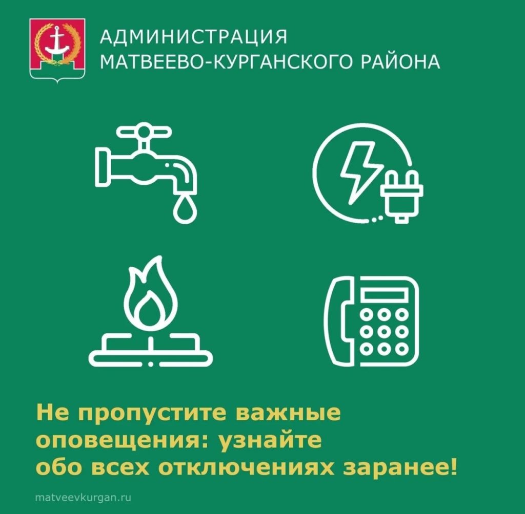 Уважаемые жители Матвеево-Курганского района! Напоминаем вам о специальном Telegram-канале, где оперативно публикуются уведомления о предстоящих плановых и аварийных отключениях электричества, воды и газа, а также ремонтах инженерных сетей. Подписавшись на этот канал, вы сможете: Быстро получать информацию о плановых и аварийных отключениях электроэнергии, водоснабжения и газоснабжения;