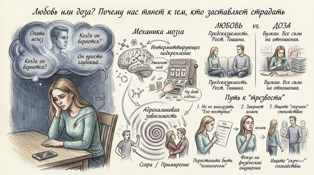 Вы когда-нибудь задумывались, почему «хорошие парни» кажутся пресными, как диетическая овсянка без соли и сахара? А вот тот самый — сложный, холодный, вечно занятый или внезапно исчезающий — вызывает внутри настоящий пожар. Лена поймала себя на этой мысли, когда в очередной раз оправдывала своего партнера перед подругами. «Он просто глубокий человек с тяжелым прошлым», — говорила она, глотая слезы после его очередного резкого слова. На самом деле, Лена была не в отношениях. Она была на «игле» эмоциональных качелей. Механика «запретного плода»: как мозг нас обманывает Почему же нас так тянет туда, где больно? Ответ кроется не в сердце, а в химии нашего мозга. Как отличить глубокое чувство от опасной «дозы»? Лена составила для себя список отличий. Посмотрите, что происходит в ваших отношениях прямо сейчас: Путь к «трезвости»: как слезть с эмоциональной иглы Выход из таких отношений часто напоминает детокс. Это больно, но это единственный способ выжить. 1. Перестаньте быть «психологом» дл