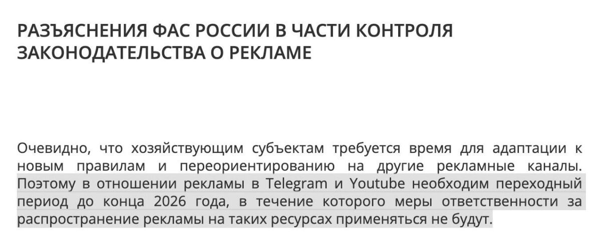 Федеральная антимонопольная служба опубликовала разъяснение по рекламе. Главное: до конца 2026 года штрафовать за рекламу в Telegram и YouTube не будут. ФАС прямо пишет, что бизнесу нужно время адаптироваться к новым правилам и перестроить рекламные каналы, поэтому вводится переходный период. Что это означает на практике: 1️⃣ Прямая реклама у блогеров пока продолжается Бренды могут размещаться как раньше — штрафов в переходный период применять не будут. 2️⃣ Это не отмена закона, а отсрочка Формально правило остаётся, но ответственность временно не применяется. 3️⃣ Telegram и YouTube остаются главными площадками блогеров Фактически государство признаёт, что убрать рекламу из этих платформ невозможно. 4️⃣ Очень важный момент Все эти ограничения не касаются монетизации YouTube. Доход от рекламы, которую показывает сам YouTube через AdSense, не является рекламой блогера и работает в обычном режиме без каких-либо проблем с законом. Именно поэтому монетизация остаётся самым стабильн