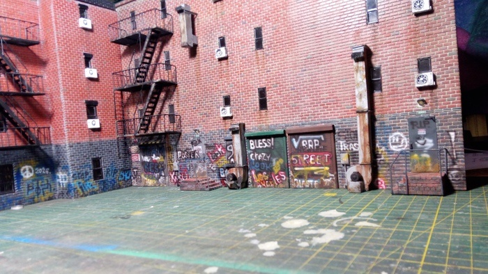 Изготовляю макет-фотозону в масштабе 1: 43. По концепту макет разделен на 2 половины, американской части города и японской. В данный момент изготовляю здания американской части города (улицы). Основной материал ПВХ пластик 3 мм толщиной. Рамы окон, кондиционеры, 3д модели напечатанные полимерным принтером. Пожарные лестницы изготовляю сам из металла. Двери, вытяжки также изготовил сам из металла. Первым делом наношу на лист пластика контуры зданий, размечаю окна и двери и после выполняю фактуру кирпичной кладки на поверхностях будущих стен. Как показано на Фото. 2. После нанесения фактуры собираю коробку здания, грунтую и произвожу покраску с последующим нанесением разного рода еффектов "старения". Фото.7 здание перед нанесением волшебных еффектов. Фото 8, здание после нанесения части еффектов. Прикинул как приблизительно будут смотреться эти два здания вместе. На этом откланяюсь. Работы ещё очень много над этим проектом. До следующих постов. Пост автора zaharijigor. Читать комментари