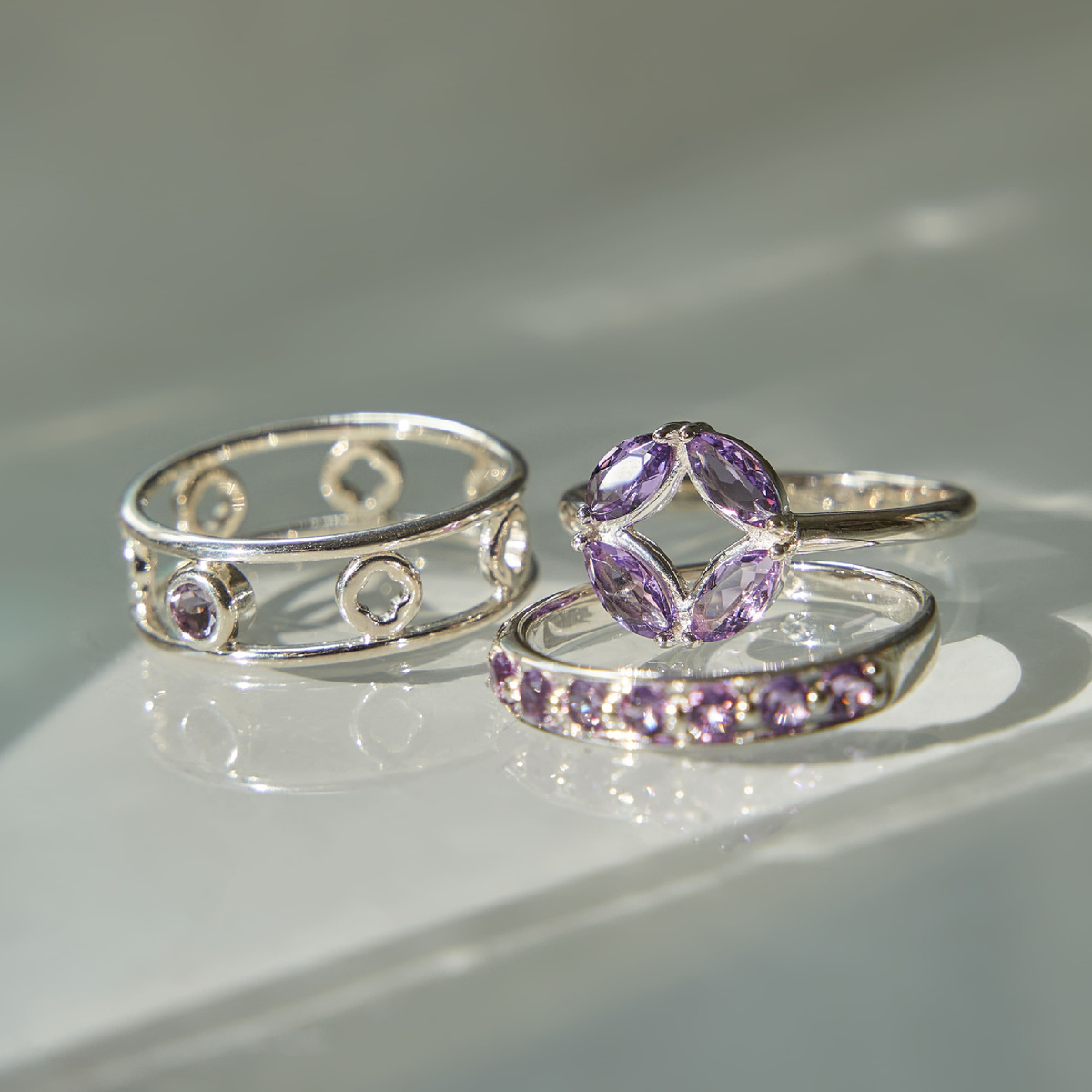 Эффектное кольцо с кругом, составленным из четырех аметистов в огранке Маркиз.