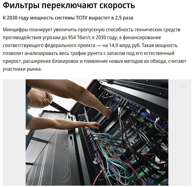 Для этого чиновники планируют увеличить пропускную способность технических средств противодействия угрозам в 2,5 раза, до 954 Тбит/с к 2030 году, узнал «Коммерсантъ» Такая мощность позволит анализировать весь трафик рунета с запасом под его естественный прирост, расширение блокировок и появление новых методов их обхода, считают участники рынка. На усовершенствование системы потребуется ещё почти 15 млрд рублей Подпишись на Телеграм Александр Семченко