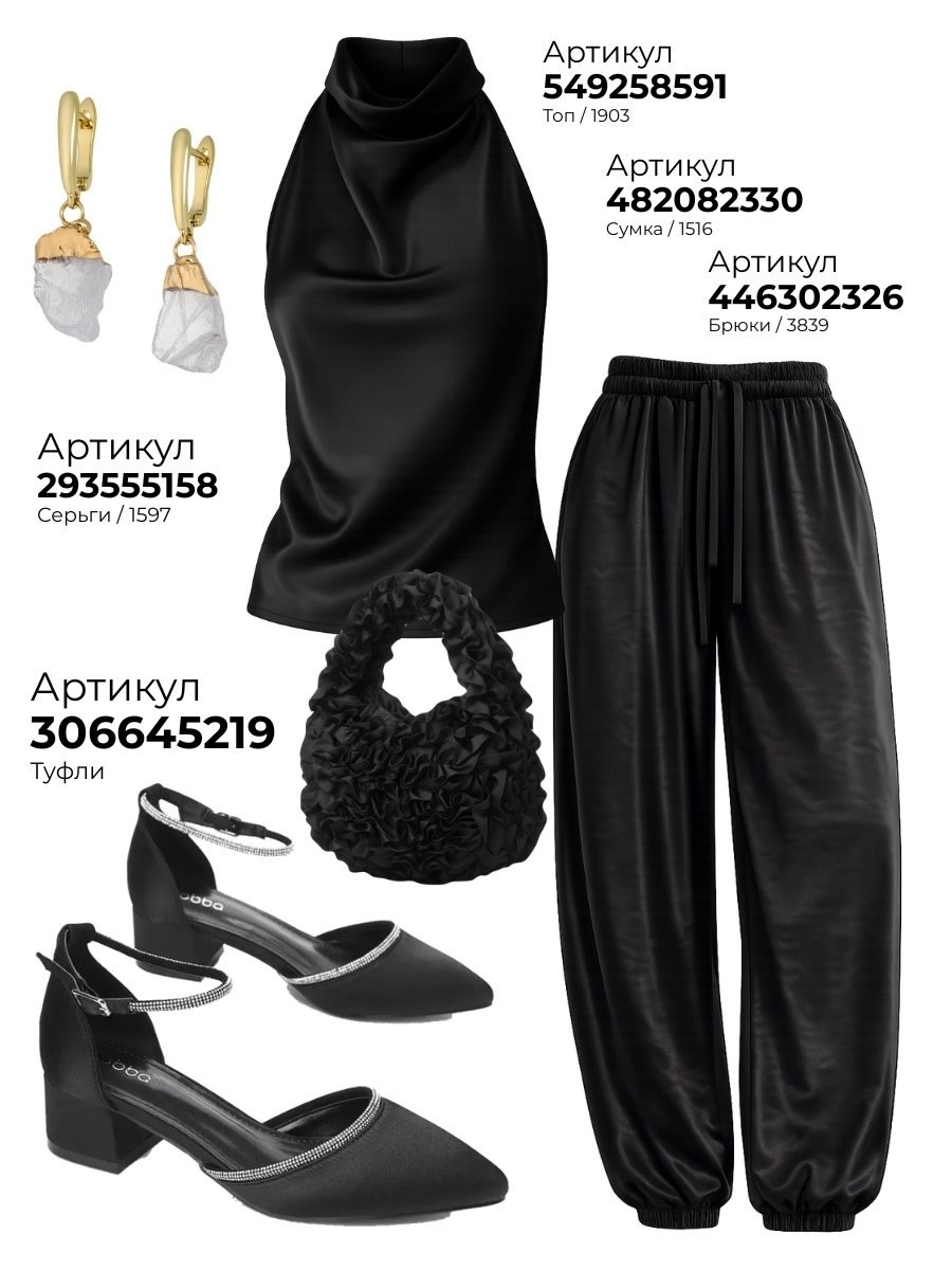 Черный топ, струящиеся брюки, акцентная сумка, выразительные серьги и туфли с сияющими ремешками создают по-настоящему модный комплект на выход. Он выглядит женственно, современно и очень уверенно.