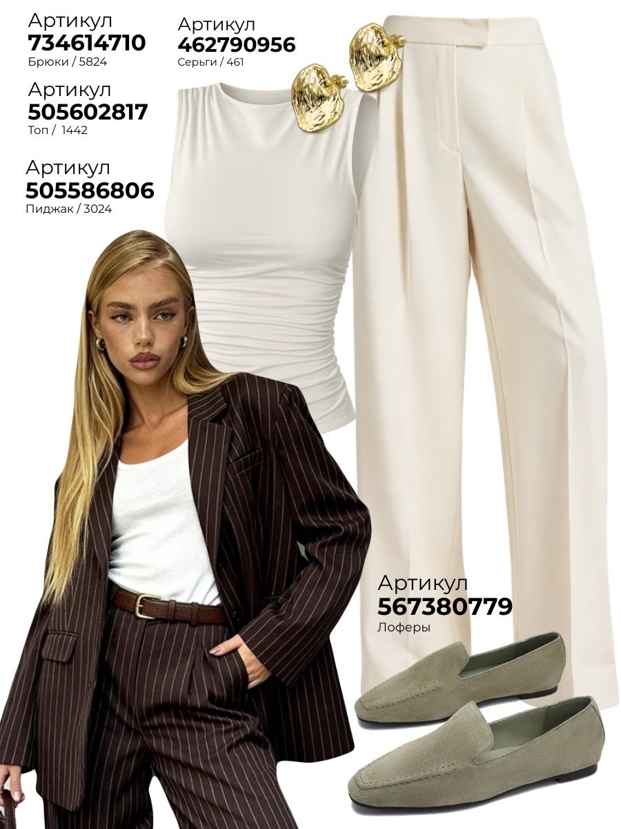 Секрет этой подборки — в очень грамотной игре на оттенках, фактурах и силуэтах. В первом образе все строится на мягком благородстве: светлые брюки, белый топ, шоколадный пиджак, золотистые серьги и необычные лоферы создают очень утонченную, спокойную и дорогую композицию. Это идеальный вариант для города, встреч, офиса, прогулок и тех дней, когда хочется выглядеть собранно, но без лишней строгости.