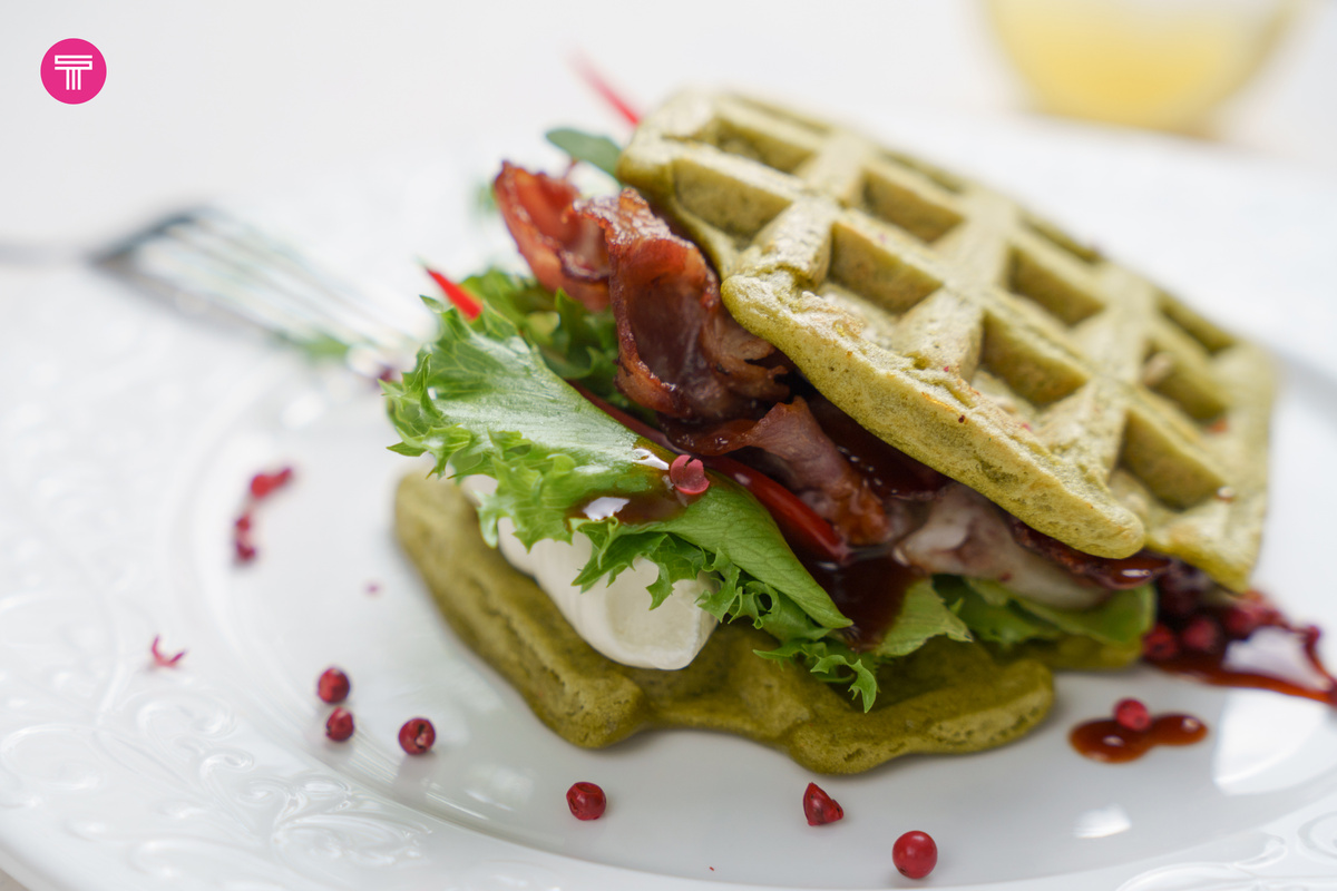 Праздник, который объединяет сладкоежек и гурманов по всему миру! Вафли известны с древности: ещё греки выпекали плоские лепёшки между металлическими пластинами. А в Средние века появились тонкие облатки (тонкий листок выпеченного пресного теста), которые продавали уличные торговцы. Само же название «вафля» пришло в русский язык из голландского языка. Особого внимания заслуживают Венские вафли. Их рецепт около 130 лет назад разработал австрийский кондитер Йозеф Маннер — основатель бренда Manner (австрийская кондитерская компания, один из самых узнаваемых брендов в Австрии и за её пределами). С тех пор Венские вафли покорили всех своей мягкой текстурой и хрустящей корочкой. Мы вдохновились этой классикой — и приготовили для вас уникальный рецепт зелёных вафель с беконом и соусом Барбекю. Сочетание, которое удивит даже искушённых гостей. Ингредиенты для вафель:
