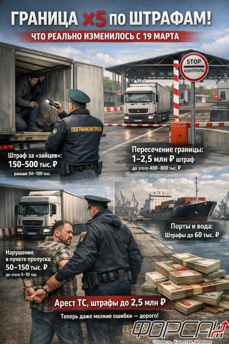 🚫 С 19 марта 2026 года вступили в силу поправки в КоАП — и для международных перевозчиков это один из самых жёстких апдейтов за последние годы. Теперь разберём по статьям и реальным рискам, а не в общих словах 👇 💸 1. Пересечение границы (ст. 18.1 КоАП) — главный удар Любая ошибка при въезде/выезде ТС: - было: 400–800 тыс. ₽ - стало: 1–2,5 млн ₽ Для должностных: - было: 30–50 тыс. ₽ - стало: 100–250 тыс. ₽ 👉 Причём это не только «жёсткие» нарушения. Под это попадает: - неправильный порядок движения к пункту пропуска - косяки при прохождении погранконтроля - отклонение от маршрута внутри зоны ❗ Отдельный риск: возможен арест ТС до оплаты штрафа 🚛 2. Перевозчик отвечает за «зайцев» (ключевой риск) Если кто-то: - спрятался в машине проник в полуприцеп - использовал ТС для нелегального пересечения 👉 штраф для компании: 150–500 тыс. ₽ (раньше 50–100 тыс.) Важно: наказывать будут даже без умысла, если не доказана должная защита транспорта. 👉 То есть теперь обязательны: - пломбирован