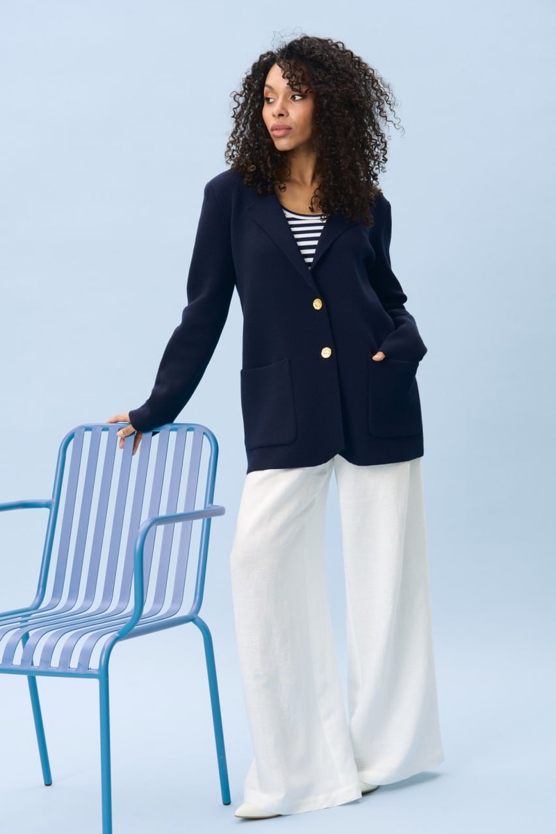 Трикотажный жакет тот самый вариант, который уместен и в офисе, и на морской прогулке, и в городе на встрече