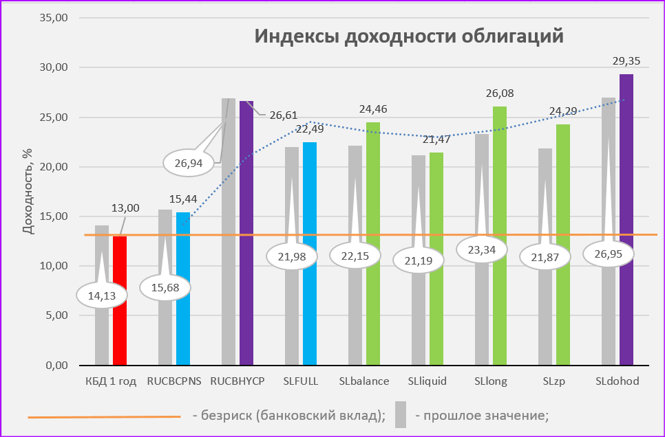 ✅ Максимальная процентная ставка по вкладам, публикуемая Банком России, 13,8, ранее было 14,06%, тренд сохраняется; ✅ Индекс ОФЗ (КБД публикуется на сайте Мосбиржи) с дюрацией 1 год (КБД 1 год на графике👆) - значительное снижение, более процента; ✅ Индекс корпоративных облигаций RUCBCPNS (публикуется на сайте Мосбиржи) - а здесь картина иная, почти нет изменений; ✅ Индекс высокодоходных облигаций RUCBHYCP (публикуется на сайте Мосбиржи) - так же без изменений; 📌 Индекс полной доходности Списка Лучших облигаций 2026 SLFULL рост на полпроцента. В Список вошло 65 облигации вместо 64 ранее, общий порог входа по YTM/CY не менялся. ✅ Индекс SLbalance портфеля СБАЛАНСИРОВАННЫЙ - рост более 1%; ✅ Доходность ликвидной части Списка SLliquid - почти без изменений; ✅ Индекс портфеля ДОЛГОСРОЧНЫЙ SLlong - рост более 3%; ✅ Индекс облигаций с ежемесячным купоном SLzp - рост почти 3%; ✅ Портфель ДОХОДНЫЙ (индекс SLdohod) - рост так же 3%. Как формируются индексы (ссылка активна). Состав портфелей об