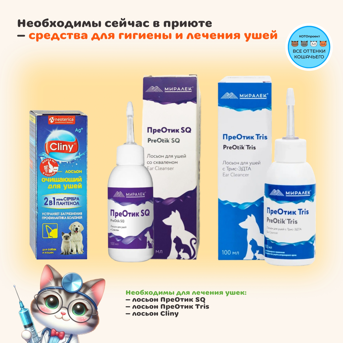 – 15 котиков весом от 2,5 до 7 кг; Для проведения обработок мы используем капли на холку фирмы «Стронгхолд» или «Селафорт» и таблетки «Фениквантел». Для гигиены ушек используем лосьоны «ПреОтик SQ», «ПреОтик Tris», «Cliny». Лосьоны для гигиены ушей: 🧴«ПреОтик SQ» – используем для профилактики отита, большой расход.