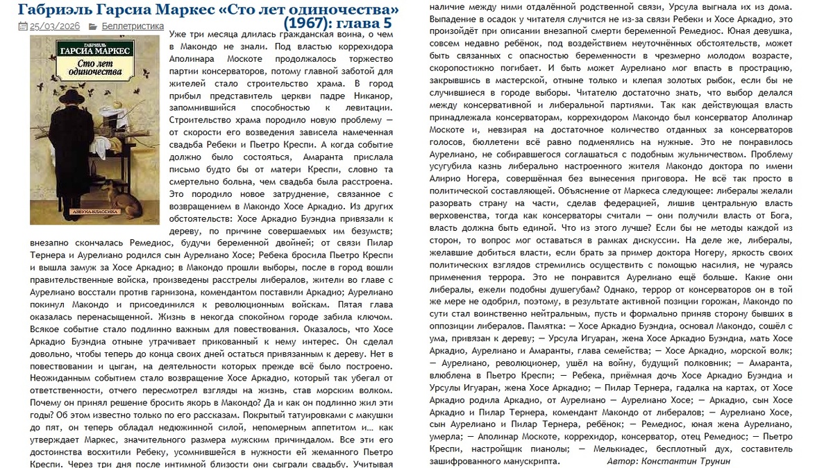 Габриэль Гарсиа Маркес «Сто лет одиночества» (1967): глава 5 | Критика