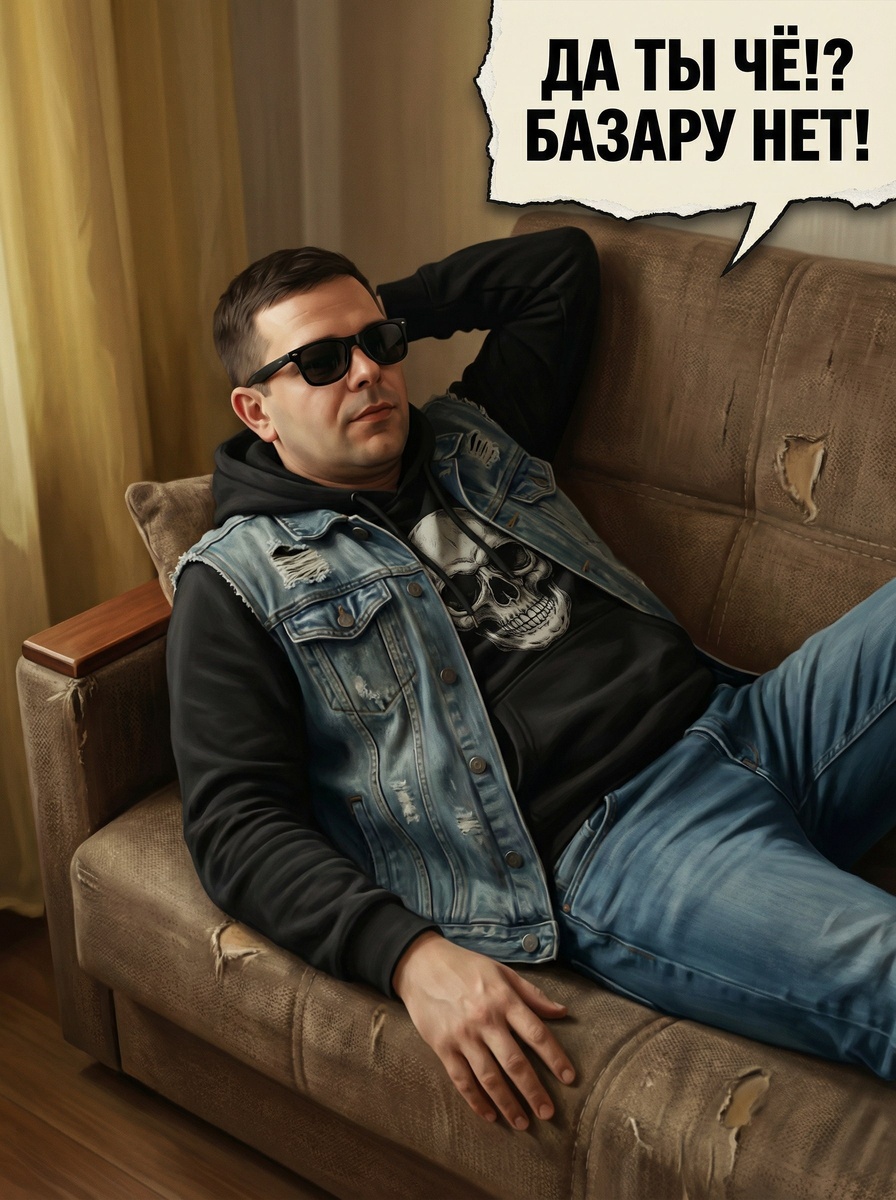 🤖Генерировать можно здесь: 👉БОТ ДЛЯ ГЕНЕРАЦИИ Режим Nano Banana 2/Pro ИНСТРУКЦИЯ Стиль: фотореалистичная цифровая живопись, гиперреализм, детализированный арт. Персонаж: Молодой мужчина с загруженного фото, сохрани черты лица без изменений. Он лежит на диване, откинувшись назад, одна рука за головой, другая свободно лежит на диване. На лице уверенное, расслабленное выражение, он смотрит в сторону. На нем черные солнцезащитные очки. Одежда: Черная толстовка с капюшоном, поверх которой надета безрукавка из потертого денима с принтом черепа. Синие джинсы. Фон и окружение: Старый, потертый коричневый диван с тканевой обивкой. Слева виден край деревянного подлокотника и желтоватая штора. Освещение мягкое, комнатное, создающее уютную, но немного мрачную атмосферу. Текст: В правом верхнем углу изображения находится комиксный "баббл" (облачко для речи) с рваными краями. Внутри крупным черным шрифтом без засечек написан текст на русском: "ДА ТЫ ЧЁ!? БАЗАРУ НЕТ!". Ракурс и качество: Кадр снят