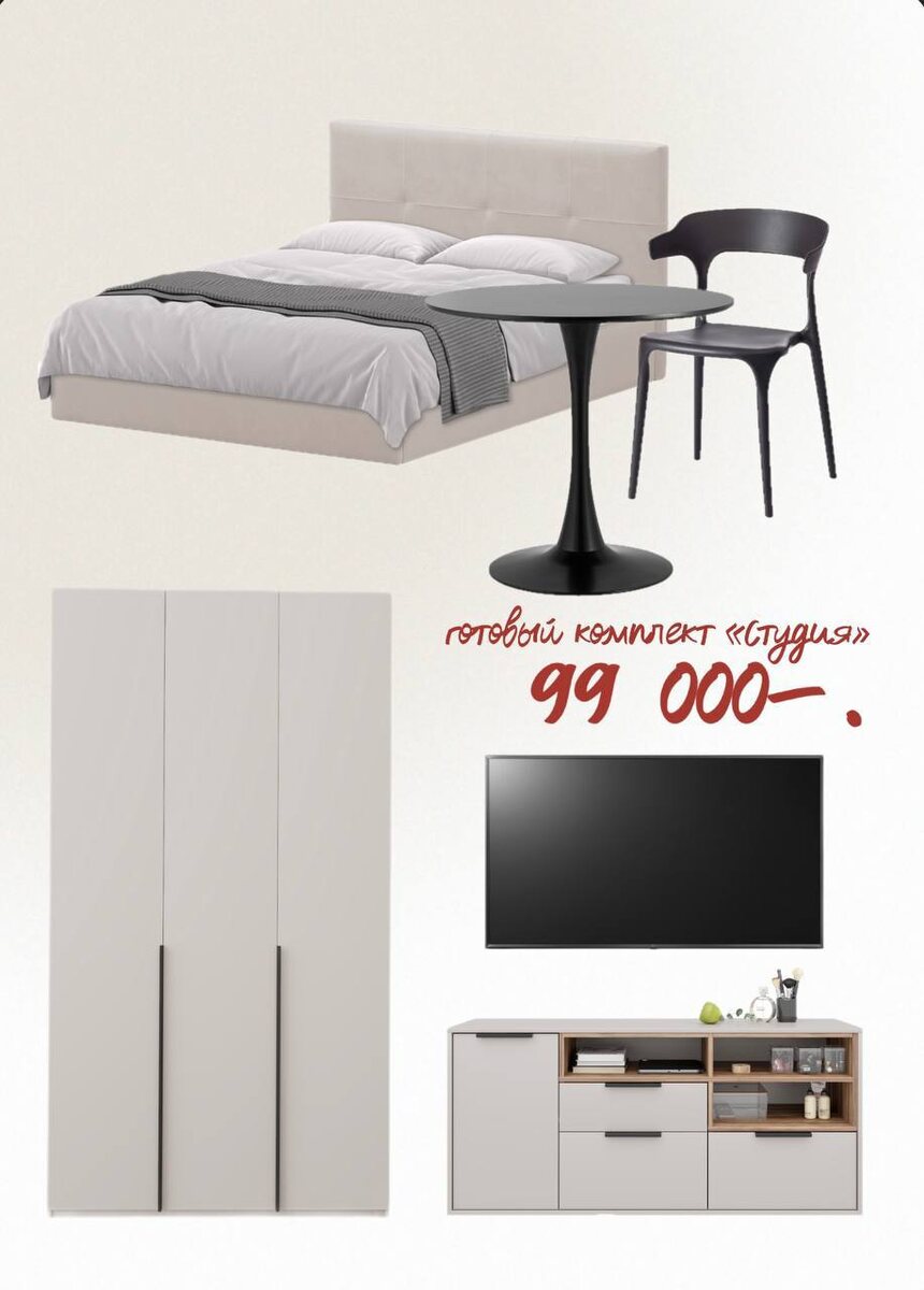 хорошая студия — это всегда заранее продуманная система, а не набор случайных предметов. На практике я регулярно вижу одну и ту же ситуацию: В итоге человек тратит больше, чем планировал, и всё равно остаётся недоволен результатом. Решение здесь одно — выбрать комплектацию квартиры под ключ. Мы сделали именно такой продукт — полноценный комплект мебели, который решает задачу студии сразу и без компромиссов. Стоимость — 99 000 ₽. И это не «базовый минимум», а уже комфортный уровень жизни. Что вы получаете Как дизайнер, я закладываю в такие решения три ключевых принципа: 1. Масштаб и пропорции Мебель подобран