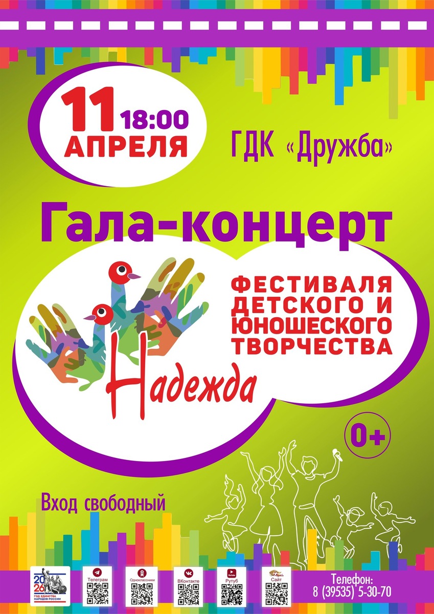 ! ❗ Обращаем ваше внимание, что изменилась дата гала-концерта фестиваля детского и юношеского творчества «Надежда». 🕑 Гала-концерт состоится 11 апреля в 18:00. В театральном зале Дворца культуры «Дружба» соберутся талантливые ребята, чтобы подарить зрителям незабываемые эмоции! В программу гала-концерта вошли лучшие вокальные, хореографические выступления, театральные постановки и инструментальное исполнение участников фестиваля. 🎶 Вход свободный! Приходите всей семьёй насладиться творчеством и поддержать юные дарования. #Надежда #Творчество #Концерт #ДетскийФестиваль #ГДКДружба