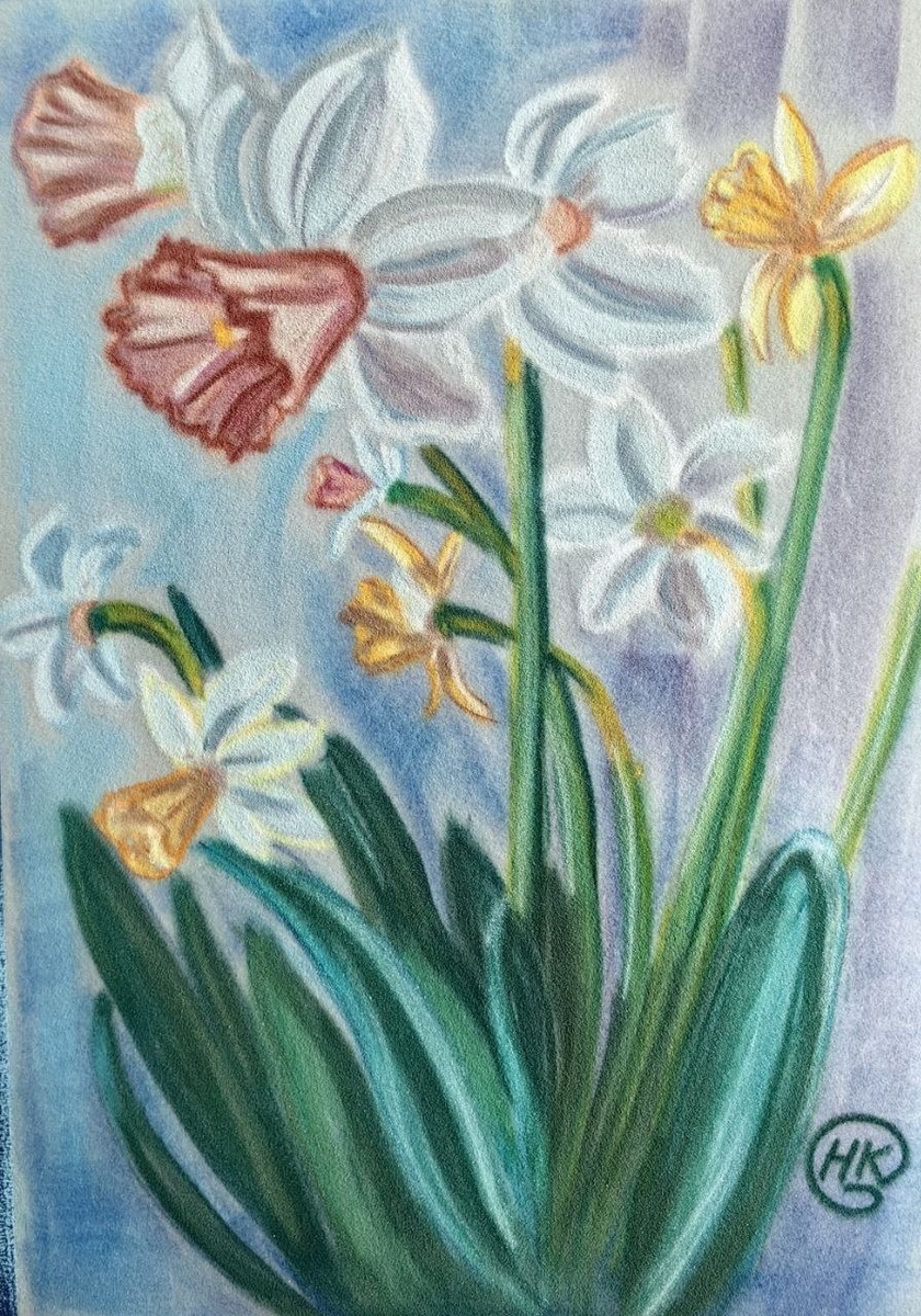 На велюровой бумаге сухой пастелью нарисовала нарциссы.