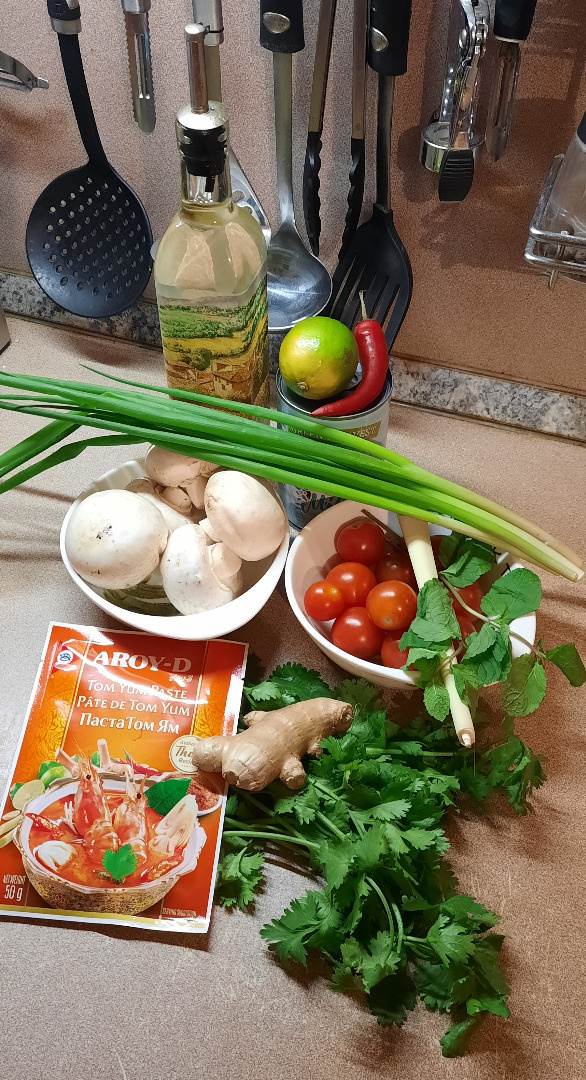 Ингредиенты Кокосовое молоко 300 мл Паста том ям aroy-d Рыбный или куриный бульон 1 л Креветки большие серые (хвосты) 5-6 шт. Мини осьминоги 5 шт. Мини каракатицы 5 шт. Мидии очищенные 200 г Шампиньонов среднего размера (или грибы шиитаке, вешенки) 6 Помидоры черри 200 г Перец чили 1 шт. Имбирь 20 г Лемонграсс 20 г Кинза 30 г Мята 15 г Лайм 1 шт. Соевого соуса 3 ст. л. Лук зелёный Чеснок 2-3 з