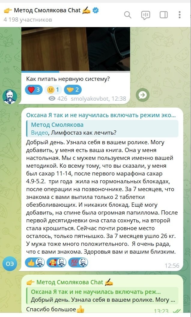 Узнала себя в вашем ролике. Могу добавить, у меня есть ваша книга. Она у меня настольная. Мы с мужем пользуемся именно вашей методикой. Ко всему тому, что вы сказали, у меня был сахар 11-14, после первого марафона сахар 4.9-5.2. три года жила на гормональных блокадах, после операции на позвоночнике. За 7 месяцев, что знакома с вами выпила только 2 таблетки обезболивающих. И никаких блокад. Ещё могу добавить, на спине была огромная папиллома. После первой десятидневки она стала сохнуть, на второй стала крошиться. Сейчас почти ровное место осталось, только пятнышко. За 7 месяцев ушло 26 кг. У мужа тоже много положительного. Я очень рада, что с вами знакома. Здоровья вам и вашим близким. * источник https://t.me/smolyakov_metod/42382