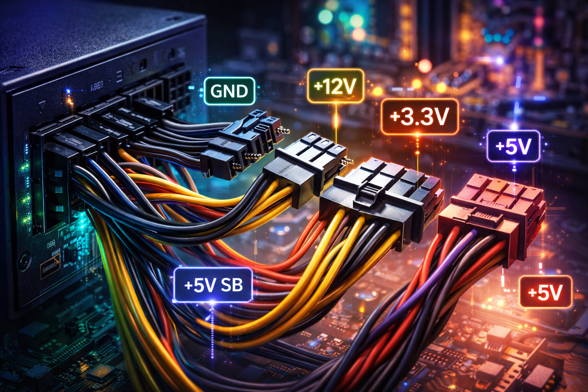 Открываешь корпус компьютера — а там пучок проводов разного цвета: жёлтые, красные, чёрные, оранжевые. Какой куда — не всегда очевидно. Разбираем распиновку разъемов блока питания по каждому типу коннектора: что подаёт, куда подключается и почему перепутать не получится.