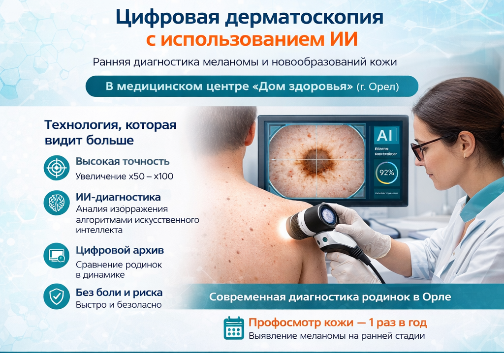 Для пациента главное преимущество такой услуги в клинике — возможность получить современный, неинвазивный и более точный первичный анализ кожных образований. Цифровая дерматоскопия с ИИ — это про раннее выявление, наблюдение в динамике и более взвешенное решение врача. Она особенно полезна тем, у кого много родинок, есть семейный анамнез меланомы, были солнечные ожоги или появилось новое подозрительное образование. Медицинский центр «Дом здоровья» в Орле — действующий многопрофильный медцентр, поэтому тема современной диагностики кожи для его пациентов выглядит практичной и востребованной.
