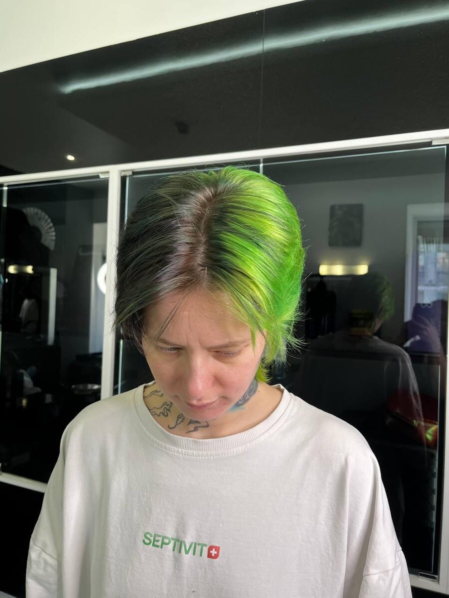 Зелёная сторона была забитая и потемневшая, поэтому сначала аккуратно осветлили, затем сделали предпигментацию - чтобы выровнять базу и получить чистый, плотный цвет без провалов. Да, внутри был сюрприз в виде старого розового, его тоже учли. Чёрную сторону обновили по длине. Перед этим убрали остаточный оттенок, чтобы чёрный лёг ровно и без грязи. Результат оставляем в фото. Как вам? Делитесь в комментариях. Работа топ-колориста Дарьи. @pointcut_family