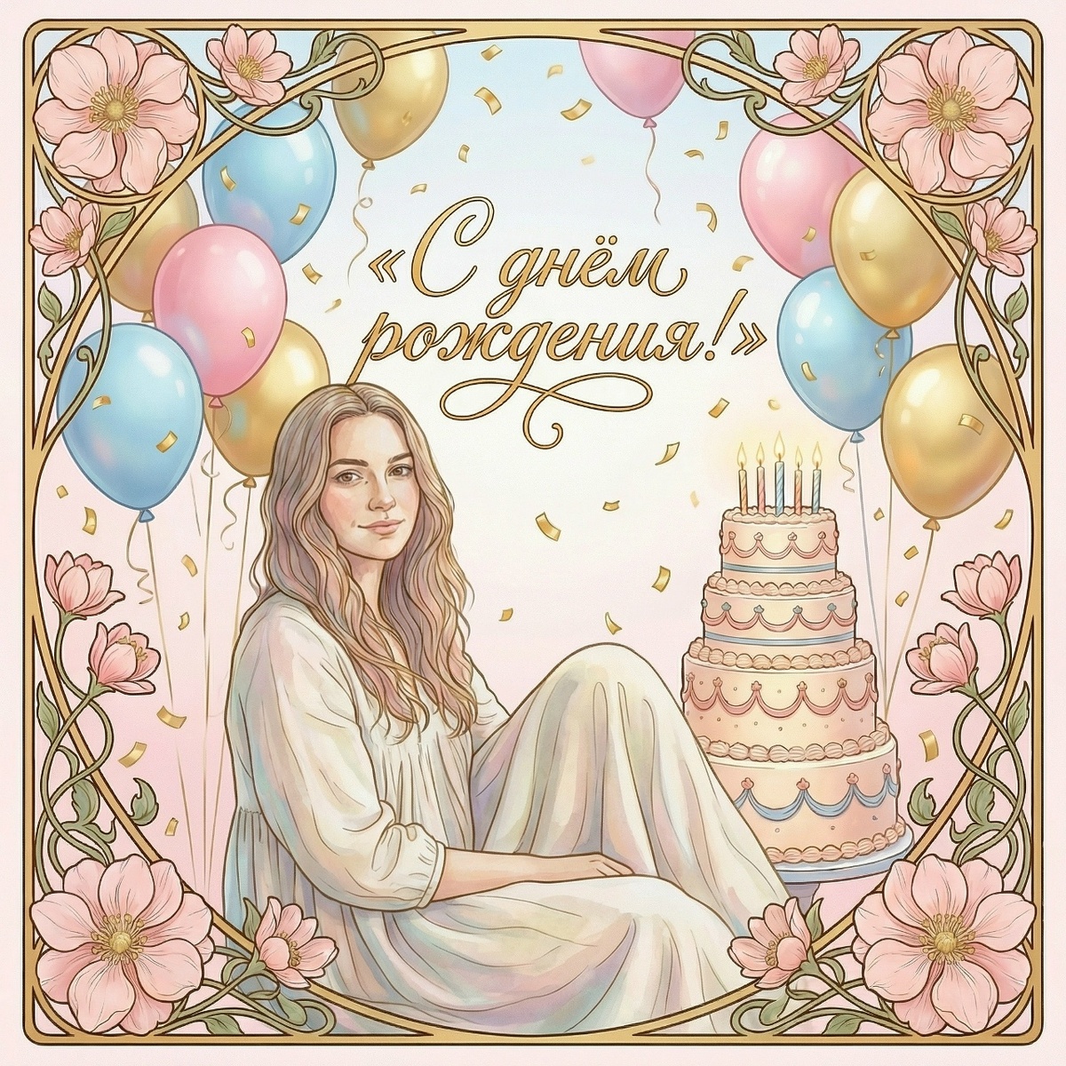 Красивая поздравительная открытка с днём рождения, праздничный и элегантный дизайн, разноцветные воздушные шарики парят в воздухе, вкусный многоярусный торт с горящими свечами, золотая конфетти сыплется сверху, яркие пастельные цвета — розовый, голубой и золотой, изящный рукописный текст «С днём рождения!» в центре каллиграфическим шрифтом, максимальное сходство, без искажения черт лица, сложная цветочная рамка по краям, высокая детализация, 8K разрешение, фотореалистичный стиль с ноткой волшебства, идеально для печати, широкий формат, шедевр в стиле Альфонса Мухи и Studio Ghibli