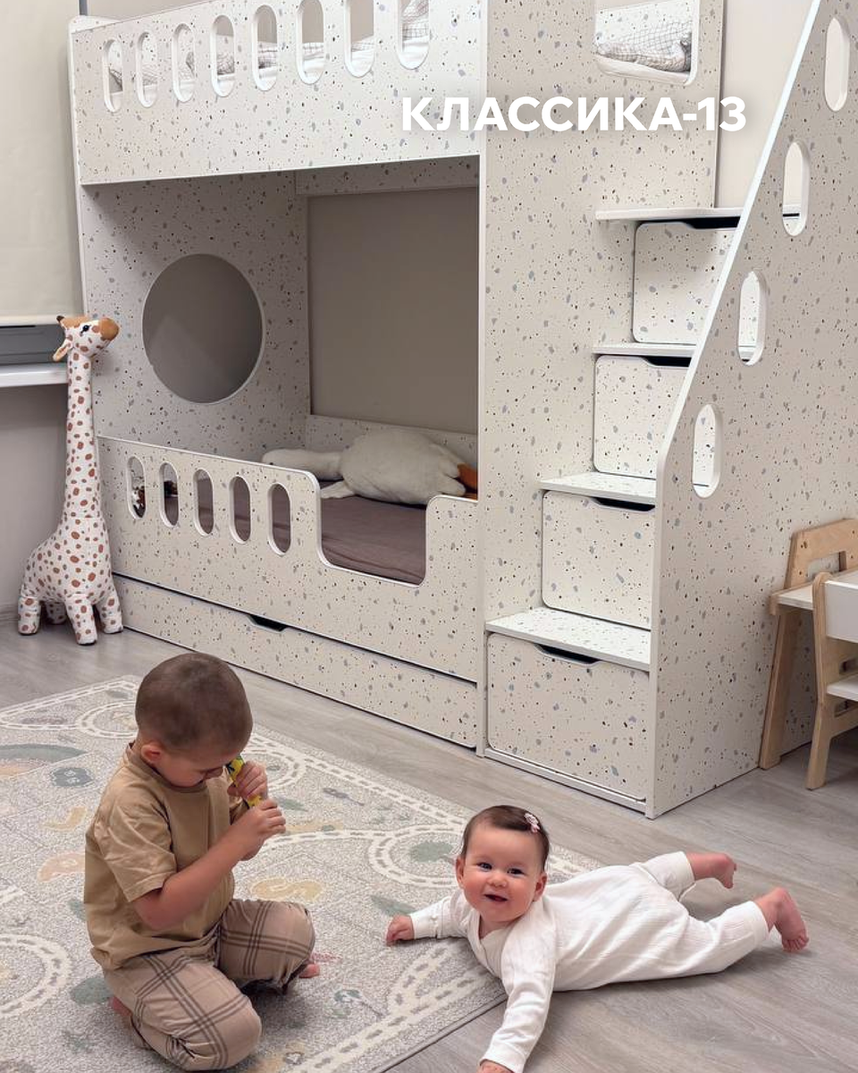 Классика-13 Такая конструкция: Особое внимание стоит уделить лестнице — модели с ящиками удобнее и безопаснее для ребёнка. Частая ошибка — оформление комнаты строго под текущий возраст ребёнка. Уже через 1–2 года потребности меняются, и интерьер теряет актуальность. Рациональнее выбирать универсальные решения. Например, выкатная кровать:
