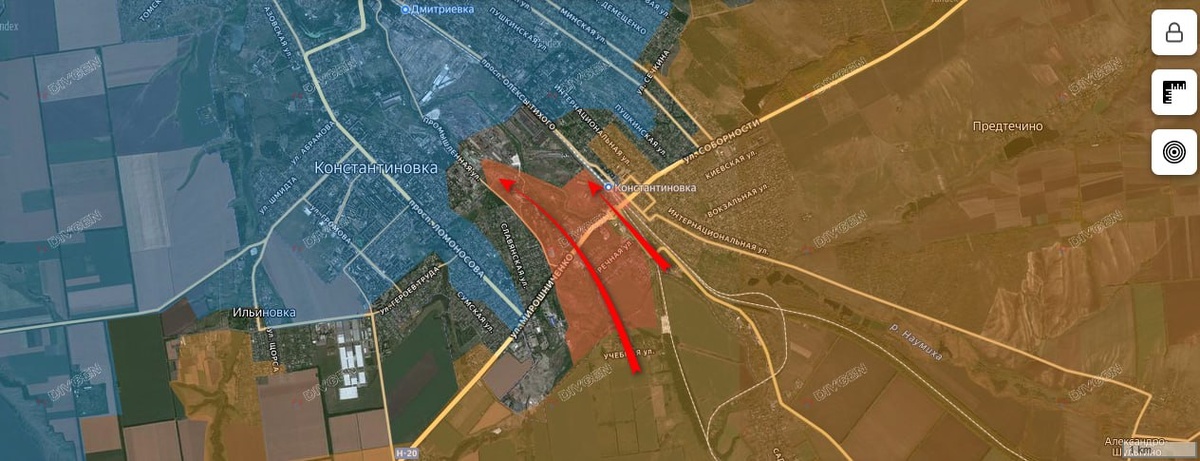 от ж/д-станции Константиновки к промзоне ООО "Мегатекс" и смогли установить контроль над районом подстанции ПС "Укрцинк-110/6 кВ". Район промзоны ОАО "Метахим" также перешел под контроль российской армии. Под контроль перешло порядко 3,5 кв. км территории Константиновки. Евгений Даманцев https://dzen.ru/id/6425916a1950720421f18802