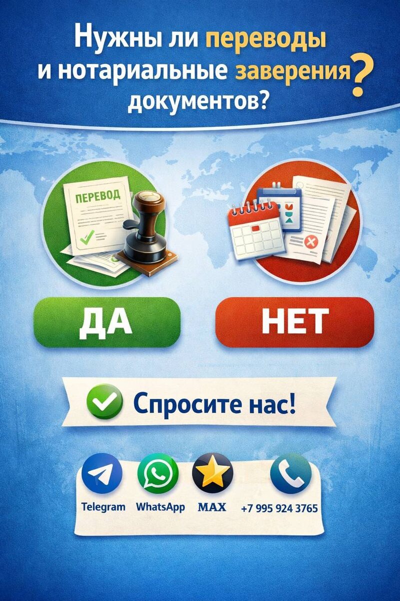 Нужны ли переводы и нотариальные заверения документов? Потребуются ли переводы документов, нотариальные заверения или апостилирование, зависит от конкретно выбранного случая и программы подачи. В одних ситуациях такие требования являются обязательными (например, при оформлении долгосрочных виз, вида на жительство или участии в официальных программах). В других случаях переводы или заверения могут быть неприменимы либо не требоваться вовсе. Поэтому необходимо внимательно ознакомиться с регламентом подачи в выбранной стране или по конкретной программе получения, чтобы избежать отказа из-за формальных несоответствий. ⸻ Как с нами связаться? 🌙 Telegram: https://t.me/Homevisa_office 💻 Whatsapp: https://wa.me/+79959243765 ⭐️ MAX: https://clck.ru/3SDbvG 🏠 Звонки: +79959243765