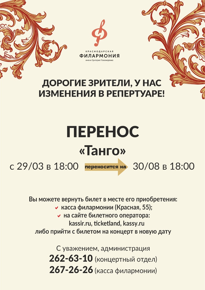 » Уважаемые зрители, информируем вас о переносе балета «Танго». По техническим причинам балет, запланированный на 29 марта, состоится 30 августа в 18:00. Мы приносим извинения за доставленные неудобства и благодарим за ваше понимание. Важная информация о билетах: • Все билеты, купленные ранее, остаются действительными. Обменивать их не нужно — просто сохраните их до августа. • Если новая дата вам не подходит, вы можете оформить возврат в месте покупки. Порядок возврата: 1. Касса филармонии: если вы покупали билет лично, деньги вернут там же (справки по телефону 267-26-26). 2. Сайт филармонии: для электронных билетов возврат оформляется через krd.kassy.ru (единый номер справки 8-800-500-7000). 3. Билетные операторы: если покупка совершалась через Тикетленд или Кассир.ру, необходимо обратиться в службу поддержки этих сервисов на их официальных сайтах.