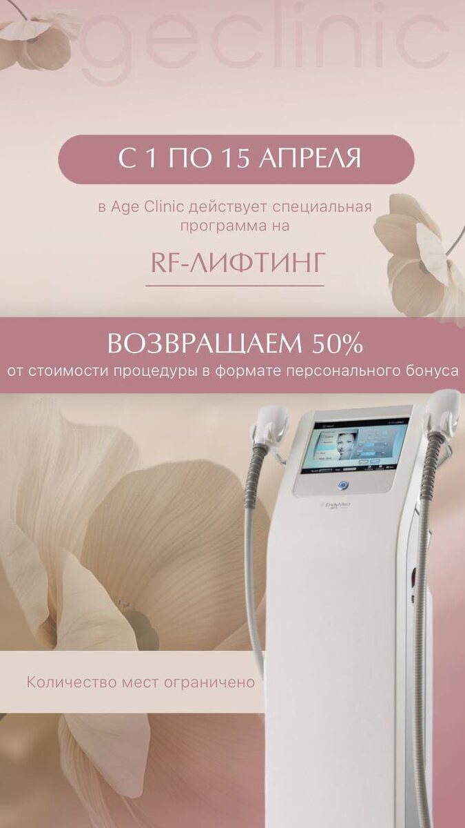 Возвращаем 50% от стоимости процедуры в формате персонального бонуса. С 1 по 15 апреля в Age Clinic действует специальная программа на RF-лифтинг. В рамках программы 50% от стоимости процедуры начисляется в формате персонального бонусного депозита, который можно использовать при оплате последующих визитов. Такой формат позволяет выстроить полноценный курс процедур и получить более выраженный, стабильный и естественный результат. Количество мест ограничено.